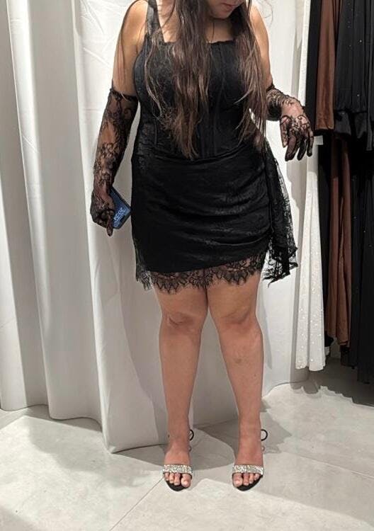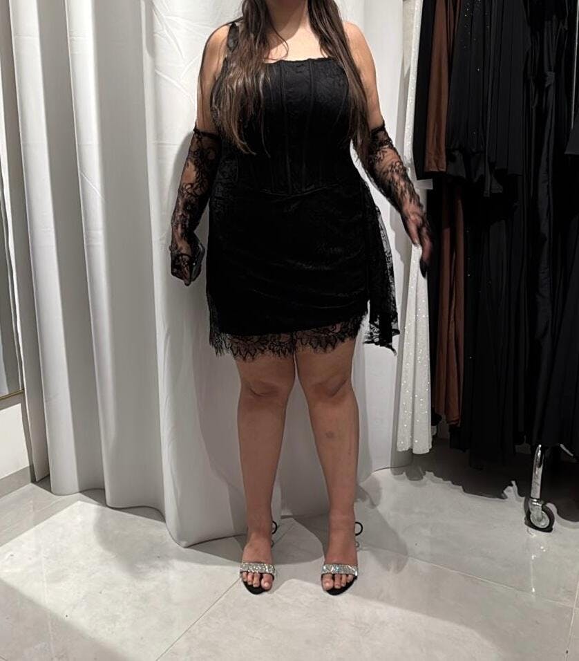 שמלת מיני שחורה תחרה ומחוך עם שרוולים