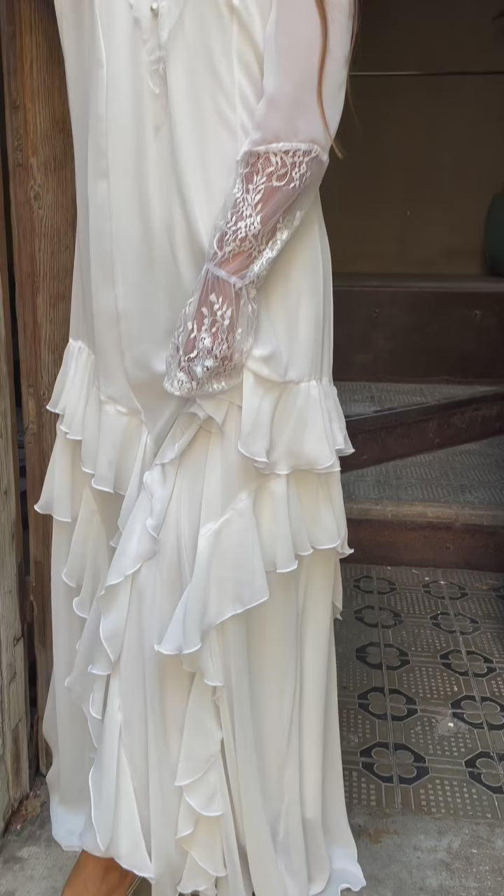 שמלת שיפון באורך מקסי ארוכה. גלבייה בשילוב תחרה צנועה