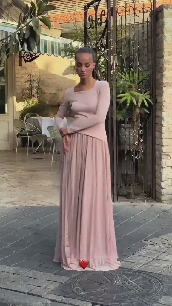 שילוב מושלם של קלאסיות ועדינות – שמלה ארוכה בגוון רוזה מעודן, עם חלק עליון בגזרה מחמיא ושרוולים ארוכים, וחצאית נשפכת ורכה בתנועתה. מתאימה במיוחד לאירועים מיוחדים, חגים או שבתות.
