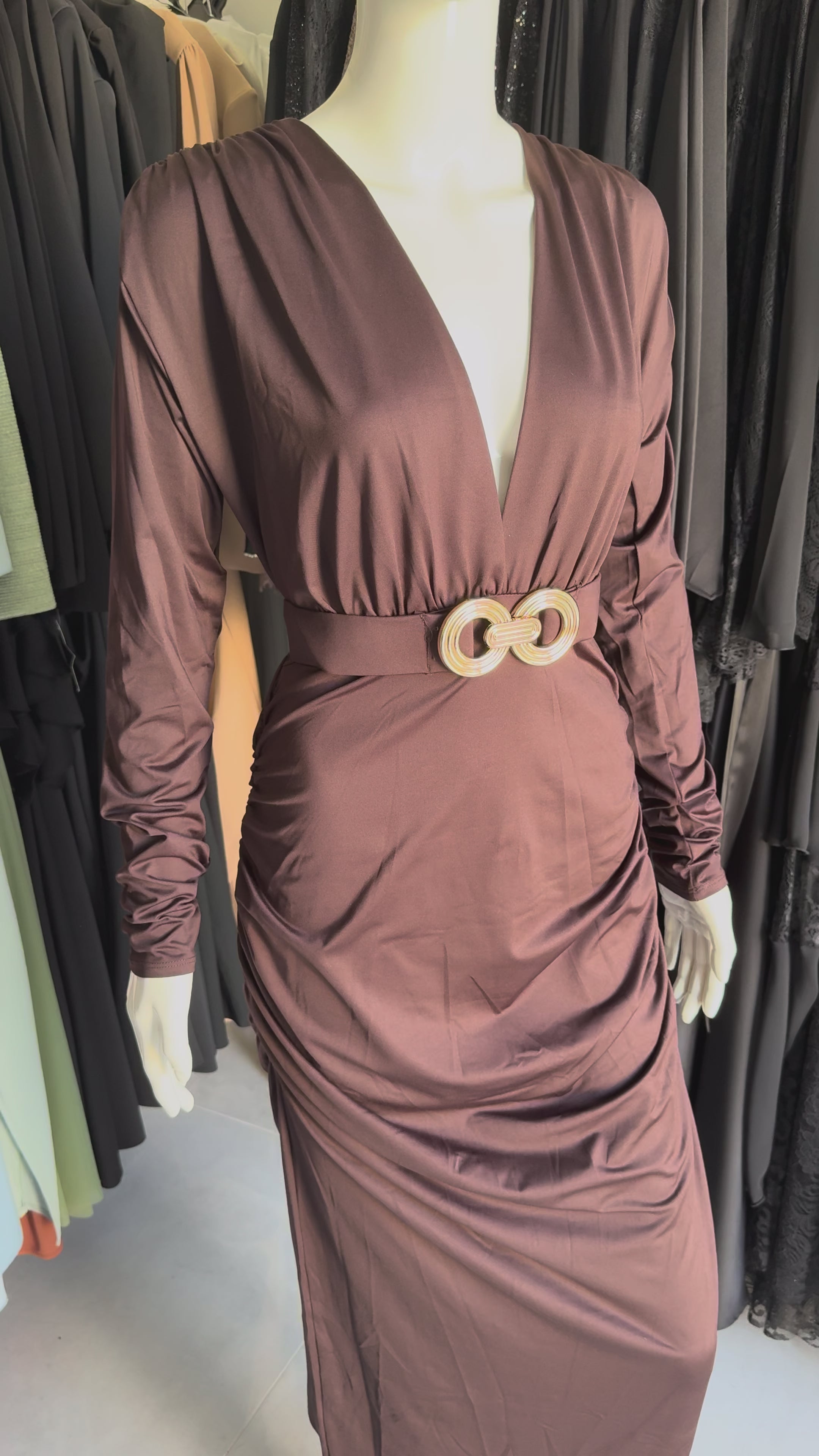 שמלת מקסי צמודה עם מחשוף וי וחגורה מתחת לחזה עם אבזם זהב